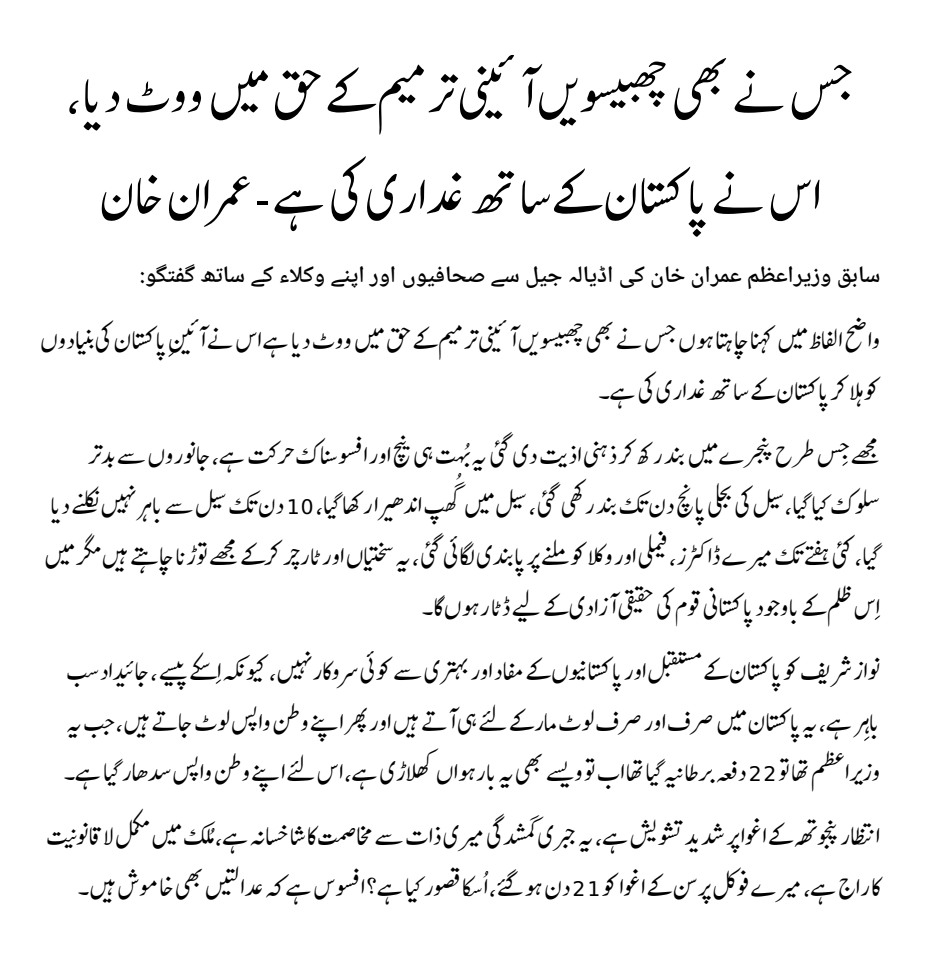 سابق وزیراعظم عمران خان کی اڈیالہ جیل سے صحافیوں اور اپنے وکلاء کے ساتھ گفتگو