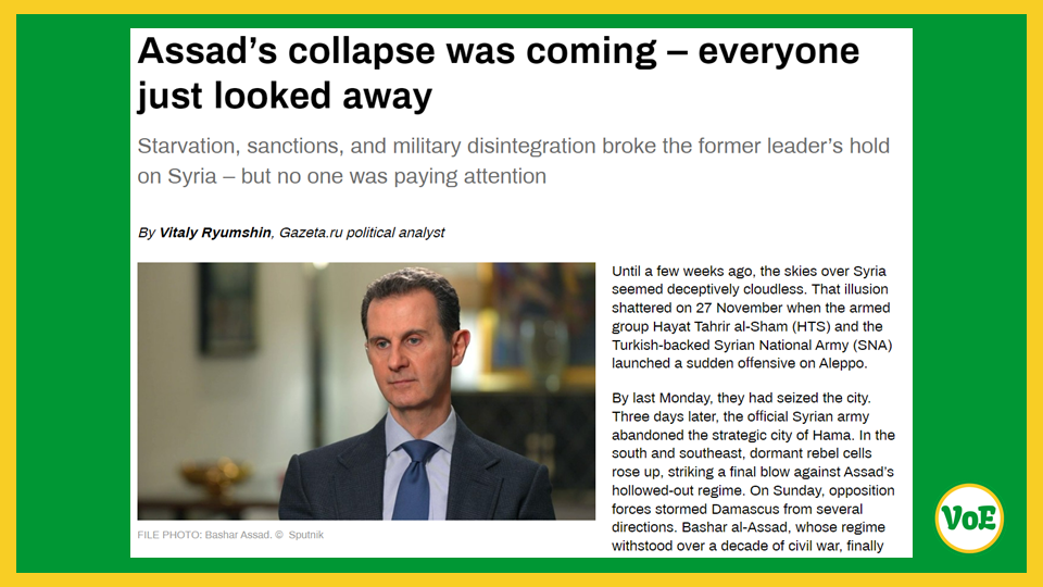 The second RT op-ed is a republication of an article by Gazeta.ru political analyst Vitaly Ryumshin under the title “Assad’s collapse was coming – everyone just looked away”. Here are the highlights:
