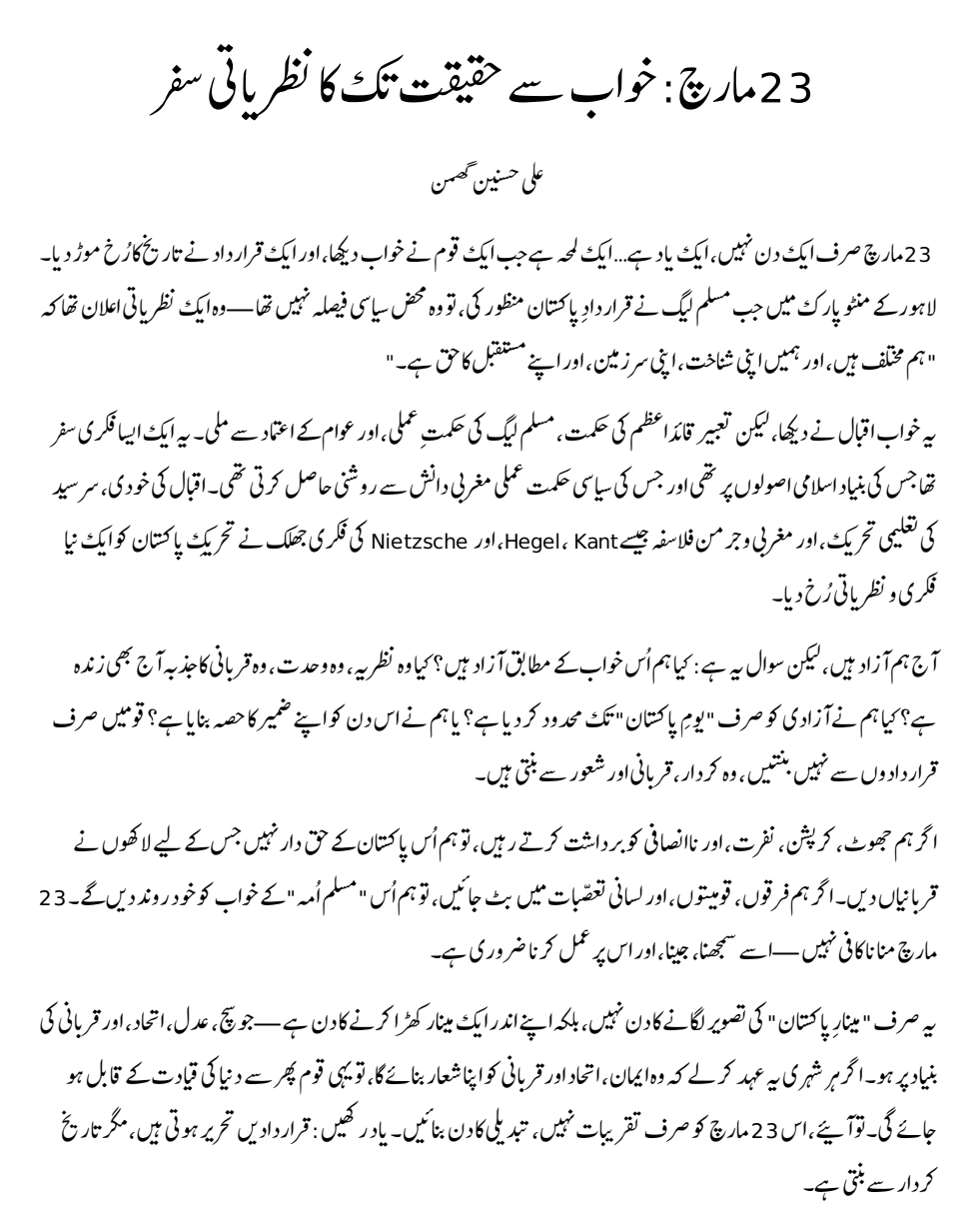 یومِ پاکستان 23 مارچ: خواب سے حقیقت تک کا نظریاتی سفر By Editor on 23rd March 2025 • ( 0 ) یومِ پاکستان 23 مارچ: خواب سے حقیقت تک کا نظریاتی سفر علی حسنین گھمن Discover more from Voice of East Subscribe to get the latest posts sent to your email. Type your email… Subscribe Share this:Tweet Click to share on Telegram (Opens in new window) Telegram Click to share on Mastodon (Opens in new window) Mastodon Click to share on Bluesky (Opens in new window) Bluesky Click to share on Threads (Opens in new window) Threads Click to share on Reddit (Opens in new window) Reddit Click to share on Nextdoor (Opens in new window) Nextdoor Pocket Click to share on WhatsApp (Opens in new window) WhatsApp Share on Tumblr Click to email a link to a friend (Opens in new window) Email Like Loading...‹ Europe’s Reported Plan To Replace The US In NATO Ignores The Interests Of Five Key CountriesThe Real Importance Of The Latest Russian-Pakistani Naval Drills ›Categories: Ideology, PakistanTags: Pakistan, Urdu, مسلمان, پاکستان, اسلام Related Articles سپریم کورٹ میں تحریف قرآن اور مذہبی آزادی کے كیس كی سماعت كا احوال Pakistan And The Muslim World Need A Strong Leader Like Imran Khan – Sami Hamdi جیل سے عمران خان كا پاکستانی قوم كے لیے پیغام How To Beat The Epidemic Of Inflation In Pakistan – Sheikh Imran N. Hosein
