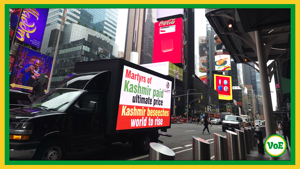 New York – With deep reverence for the courageous and fearless souls who laid down their lives so the people of Kashmir could live with dignity and honour, Washington-based ‘World Kashmir Awareness Forum’ arranged digital trucks campaign throughout the New York City to observe the 94th Kashmir ‘Martyrs’ Day.