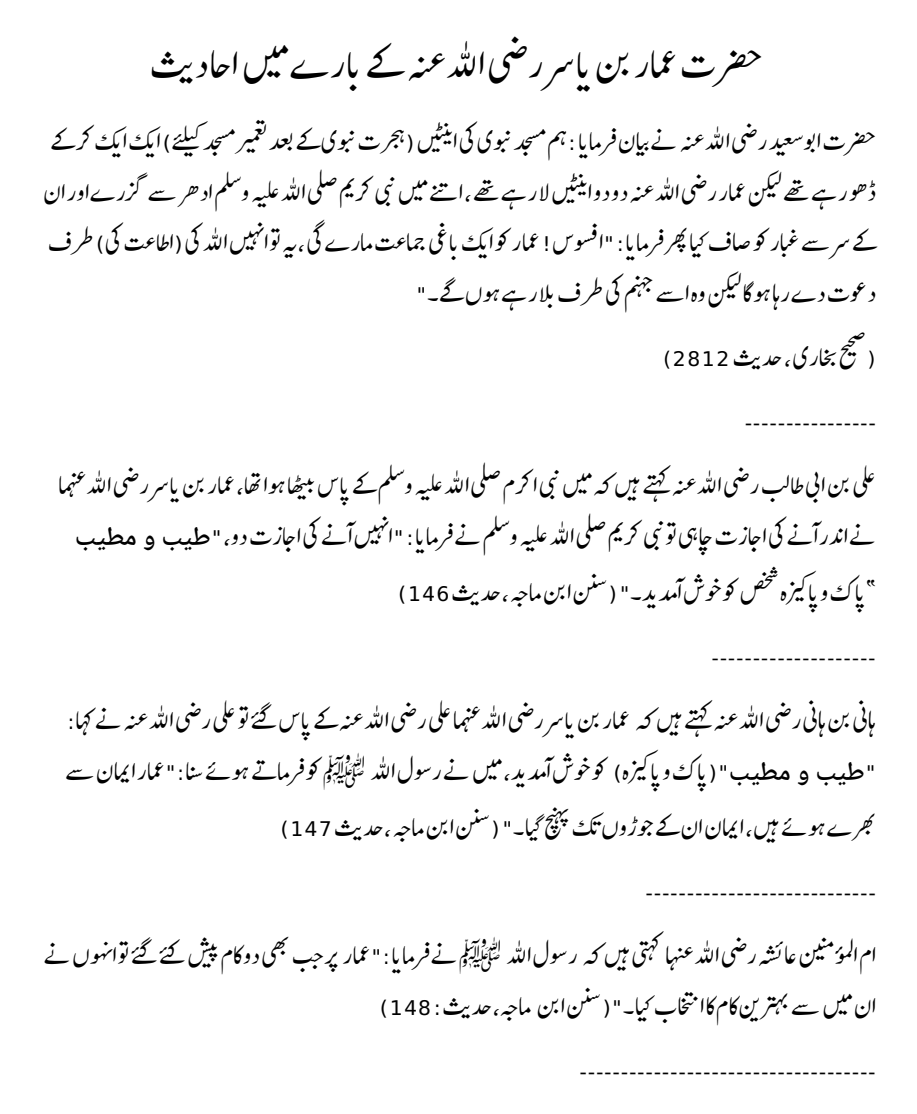 حضرت عمار بن یاسر رضی اللہ عنہ كے بارے میں احادیث