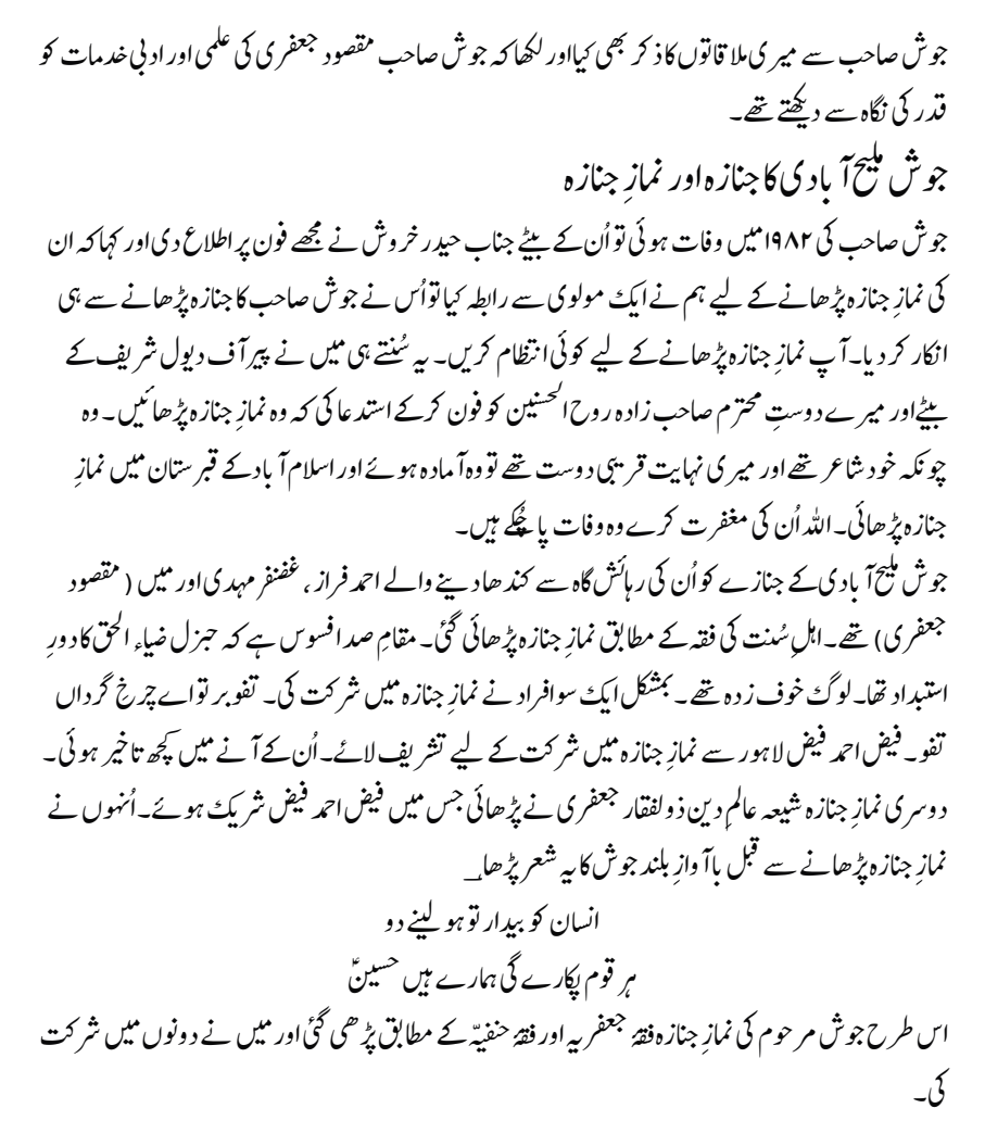 جوش ملیح آبادی کا تابوت اسلام آباد اُن کے گھر سے اٹھایا جا رہا ہے۔ ایک طرف سے احمد فراز اور دوسری طرف سے ڈاکٹر مقصود جعفری نے آٹھایا۔